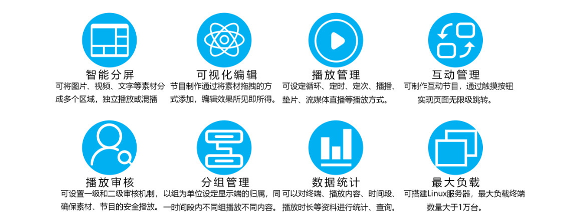 詳盡的終端配置信息,定時開關(guān)機,遠(yuǎn)程更改視頻輸出類型及分辨率;統(tǒng)一實時監(jiān)控;故障 及時告警,實時反饋當(dāng)前播放內(nèi)容及音量控制;終端程序更新可通過系統(tǒng)自動升級。