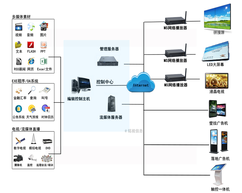 視頻、圖片、文本(滾動字幕)等多媒體文件上傳至服務(wù)器,制定各種多媒體組合播放內(nèi)容, 下發(fā)給各顯示終端,可設(shè)定循環(huán)、定時、定次、插播、墊片、流媒體直播等播放方式。