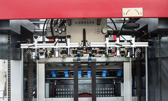 ●增加配置功能可任選毛輪外收箔、覆卷內收箔兩種收箔方式,內收箔更加方便,縱向送箔裝置可整體拉出,便于操做,具有電化鋁自動下壓裝置,防止刮傷電化鋁。